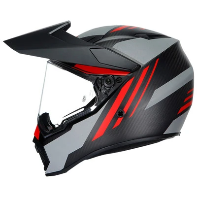 The AGV AX-9 Helmet is an all-new design over the popular AX-8 DS EVO Helmet. It starts with the lightweight carbon, aramid and fiberglass shell and a redesigned peak for optimal aerodynamics. The peak itself is adjustable to reduce the sail effect at high speeds. Superior ventilation is achieved with 5 total vents: an adjustable chin-vent, two brow inlets and 2 extractors. The design of this helmet also allows for four different configurations — peak / visor, no peak / visor, peak / goggles, no peak / goggles — meaning it can handle practically any riding scenario.